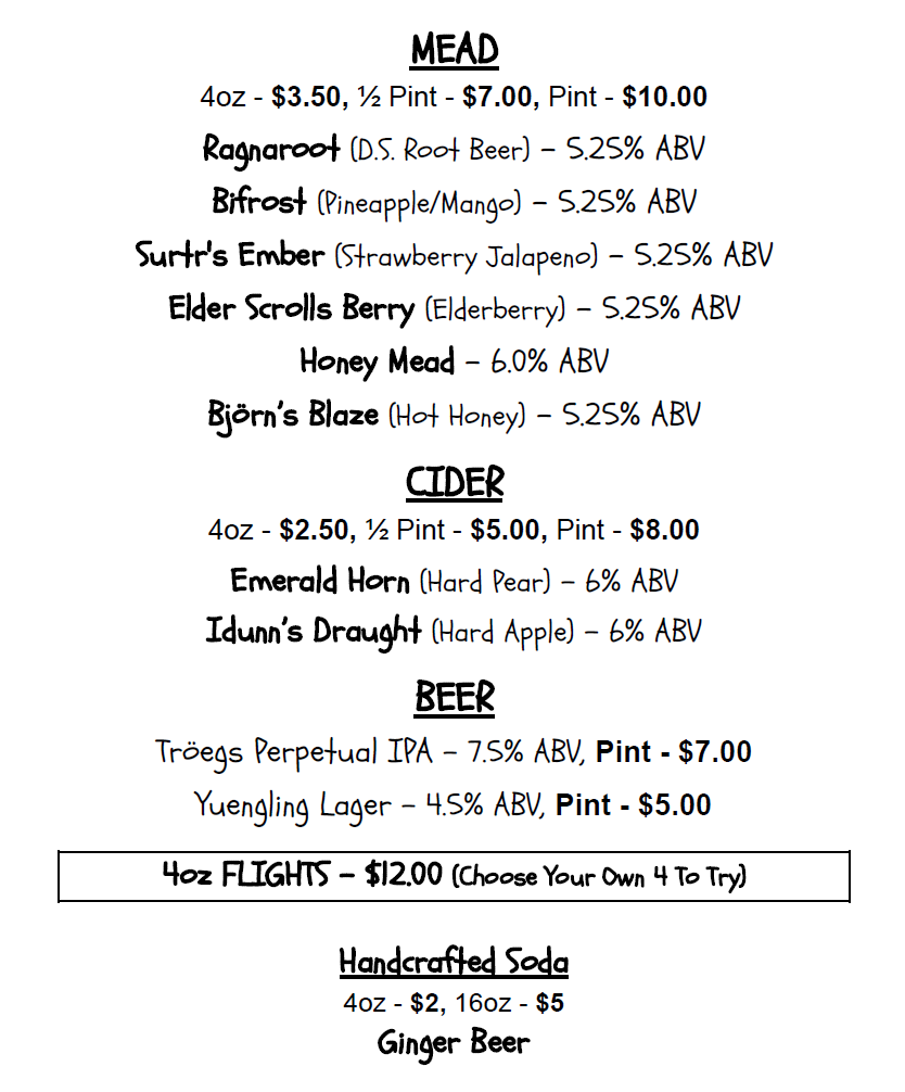 Enjoy Drunken Smithy’s own mead and hard cider on tap, along with select craft beverages from other local brewers.