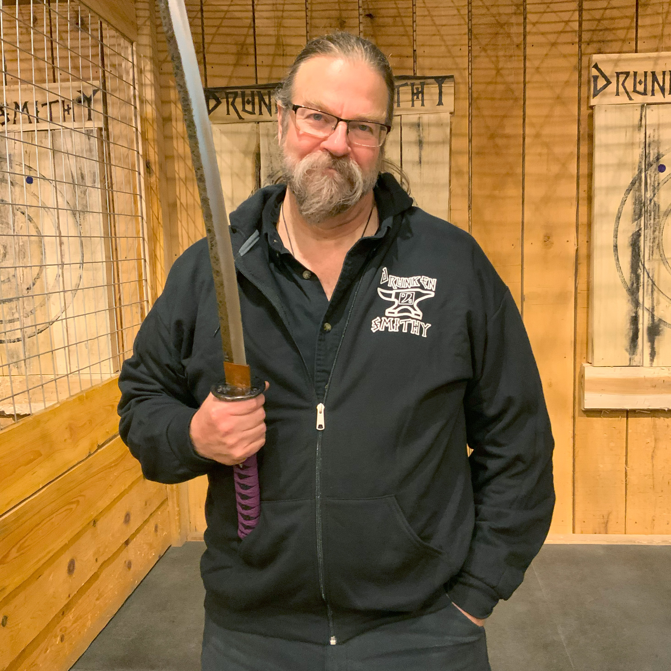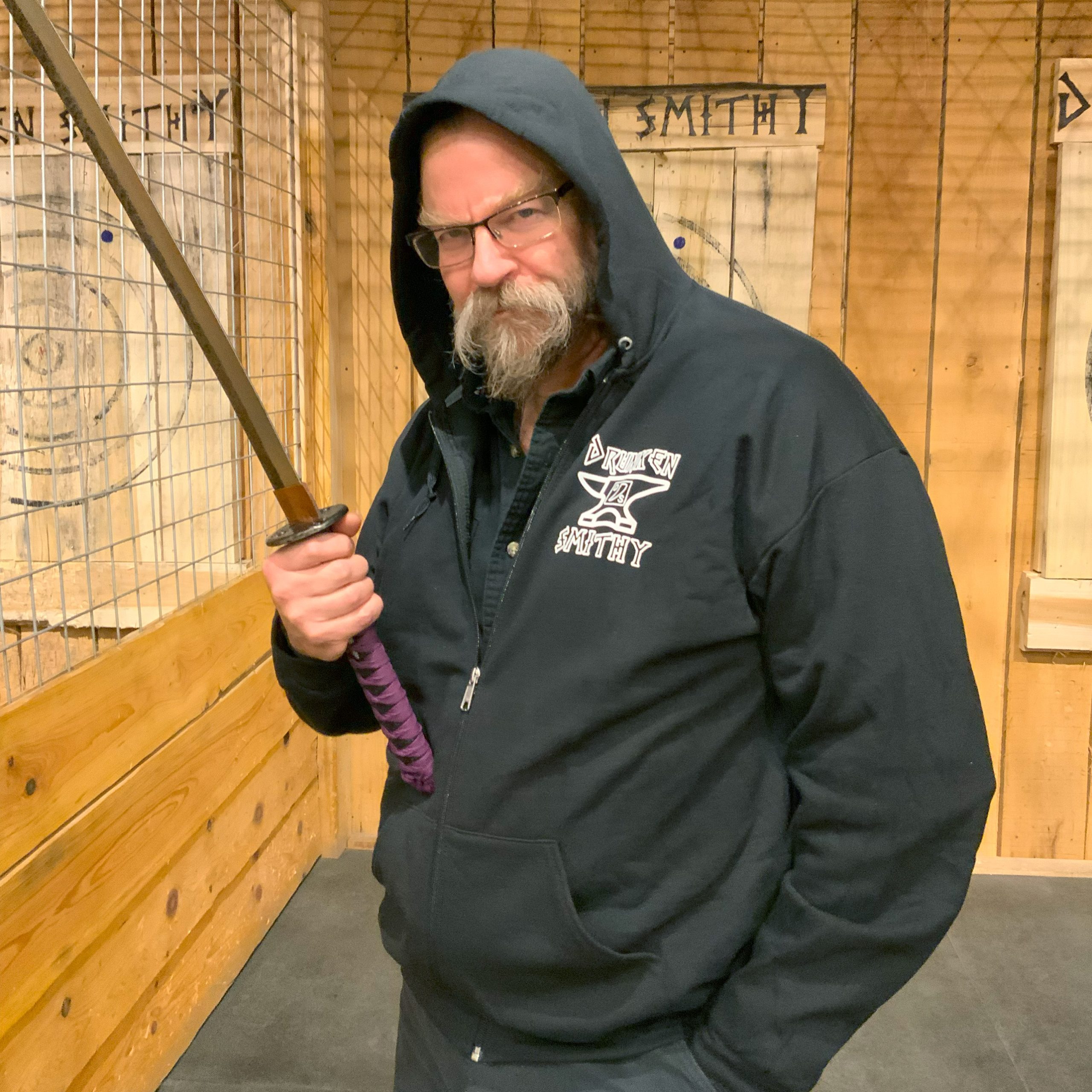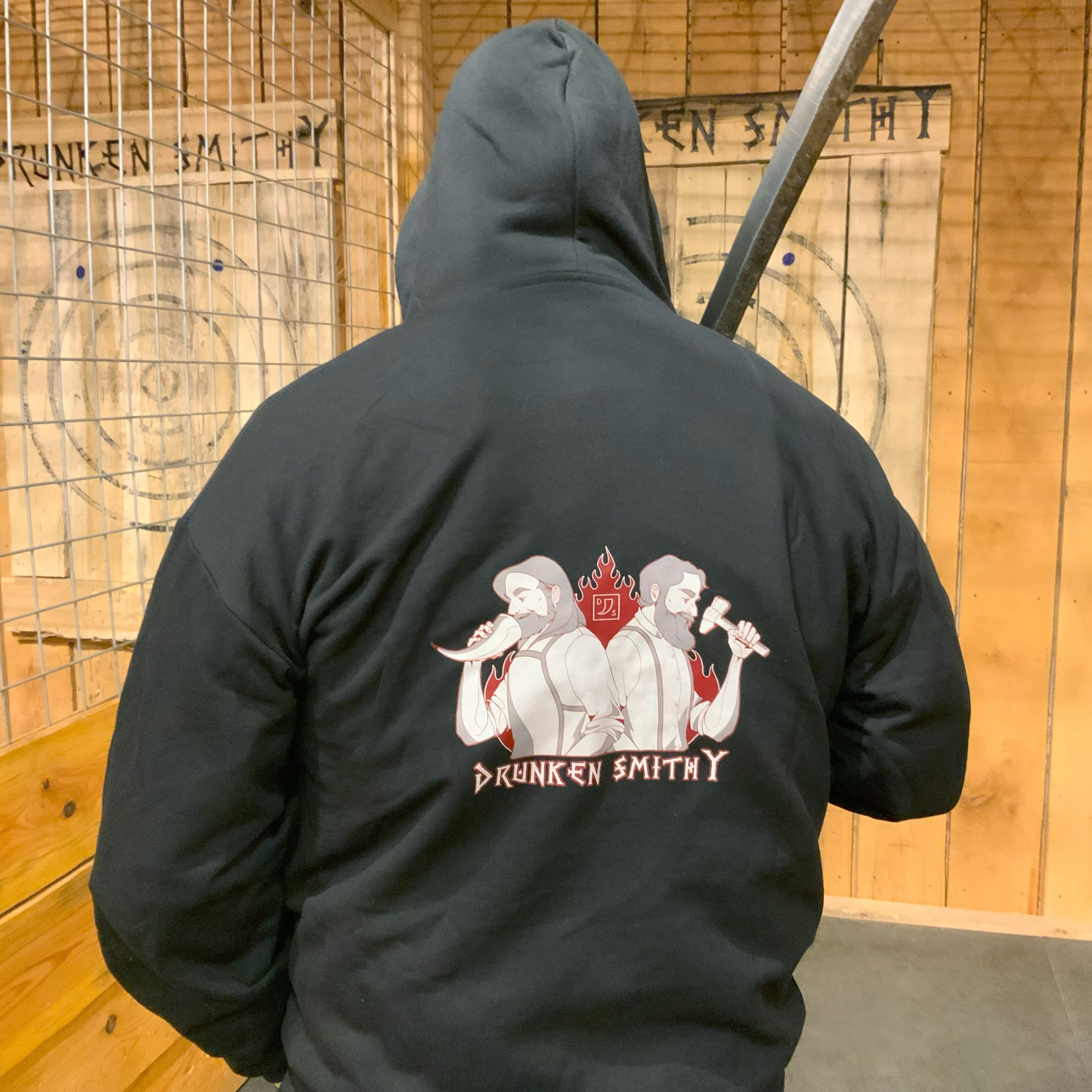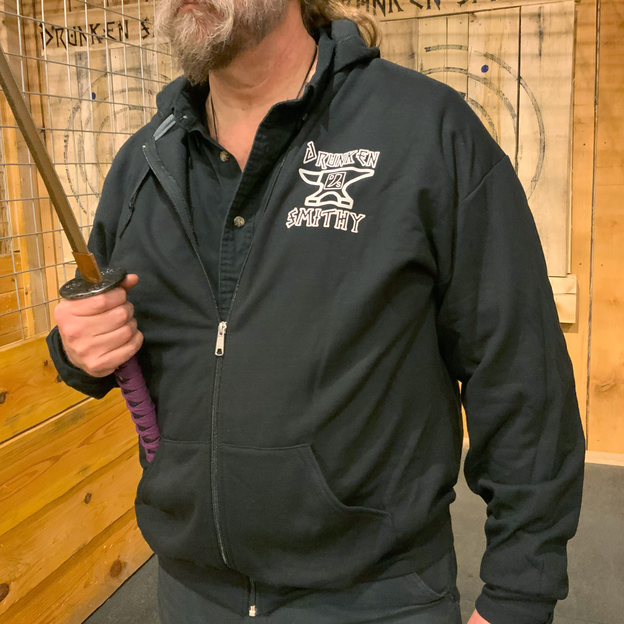 Drunken Smithy Zip Up Hoodie in Black modeled by Greg with Drunken Smithy logos on the front and back